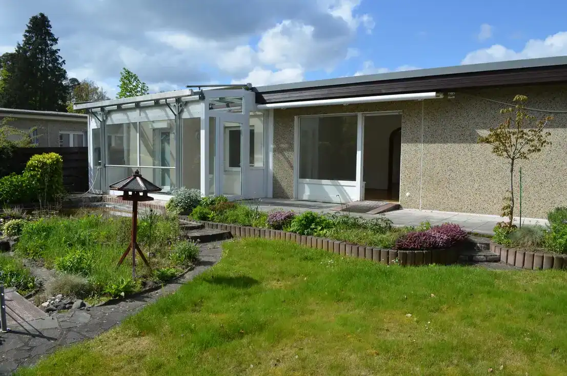 Flaches Haus mit Garten und SträuchernPerson in Anzug lächelt in die Kamera.