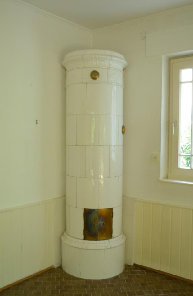 - Antiker weißer Zylinder-Kachelofen befindet sich Im EG – Anschluss zum Außenschornstein.