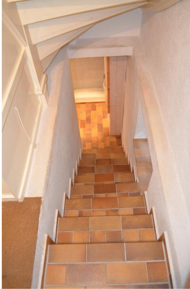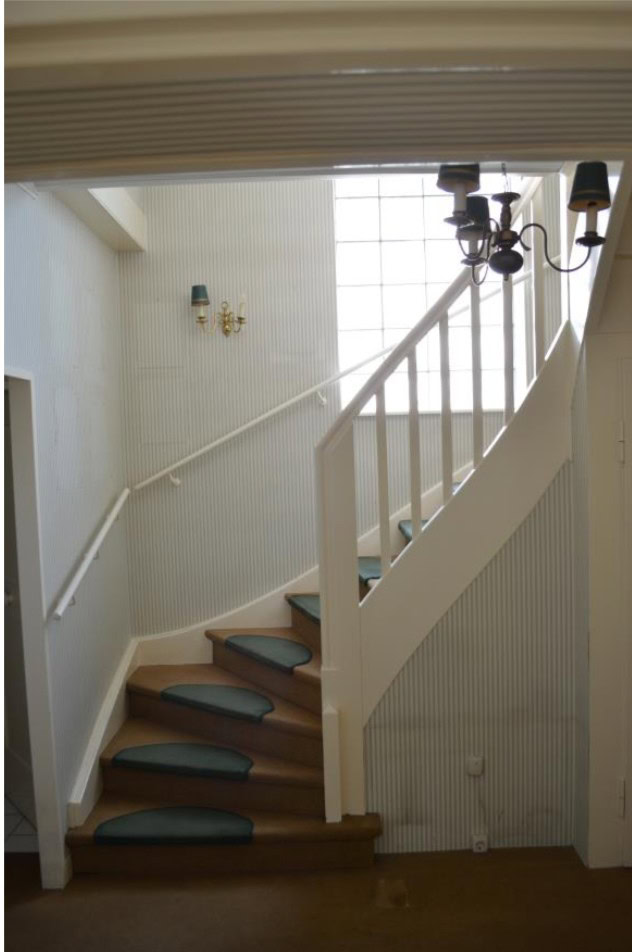 - Helles Treppenhaus mit Glasbausteinen, gewendelten Treppenteil, Trittstufen aus Holz.